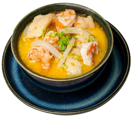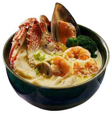 SHRIMPS, CALAMARI, CRAB, FISH FILLET WITH CREAMY FISH BROTH